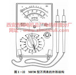 1)指針式萬用表。指針式萬用表主要由表頭、測量線路和轉(zhuǎn)換開關(guān)三部分組成。表頭用以指示被測量的數(shù)值:測量線路用來把各種被測量轉(zhuǎn)換到適合表頭測量的直流微小電流;轉(zhuǎn)換開關(guān)實現(xiàn)對不同測量線路的選擇.以適應(yīng)各種測量的要求。指針式萬用表的外形可以做成便攜式或袖珍式.將刻度盤、轉(zhuǎn)換開關(guān)、調(diào)零旋鈕以及接線柱(或插孔)裝在面板上.各種型式的萬用表的外形布置不盡相同,MF3O型萬用表的外形結(jié)構(gòu)如圖1-22
