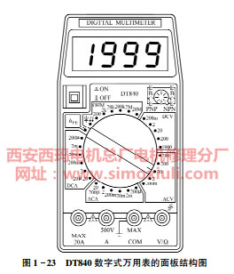 字萬用表.可以進行交直流電壓(電流)、電阻、二極管、帶聲響的通斷及晶體管HFE的測試.并具有極性選擇、過量程顯示及全址程過載保護的特點。D T840 數(shù)字式萬用表的面版結(jié)構(gòu)圖.如圖l-23 所示。