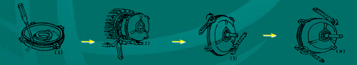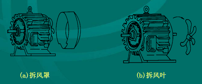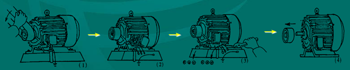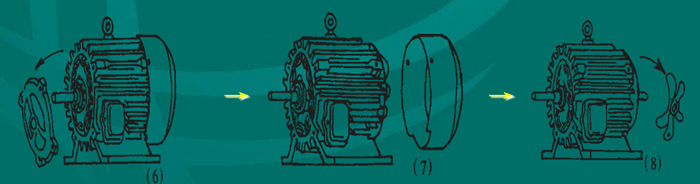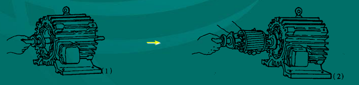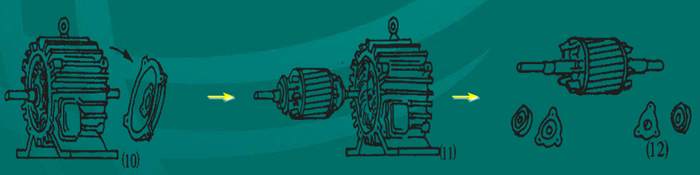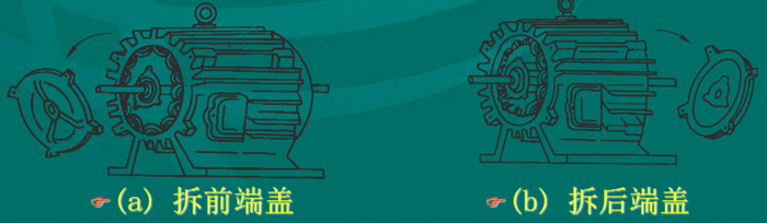 拆卸端蓋前,應在機殼與端蓋接縫處做好標記。然后旋下固定端蓋的螺絲。通常端蓋上都有兩個拆卸螺孔,用從端蓋上拆下的螺絲旋進拆卸螺孔,就能將端蓋逐步頂出來。