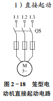 直接起動也稱全壓起動,這種方法是在定子繞組上直接加上額定電壓來起動的,其電路如圖2 - 18 所示。如果電源的容量足夠大,而電動機的額定功率又不太大( 根據經驗,電源容量一般應大于電動機容量的5倍).則電動機的起動電流在電源內部及供電線路上所引起的電壓降較小,對鄰近電氣設備的影響也較小,此時便可采用直接起動。